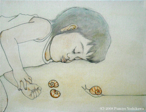 "Dendenmsuhi " 11 "x 14 ", 2008, Sumi-ink, nihonga dry pigments, acrylic on canvas