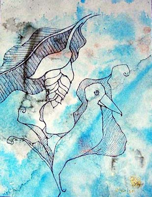 Una Pjalo de Palenque (A Bird of Palenque) ,@2003, 4 "x 3 "(inches) Acrylic,oil ink on paper.